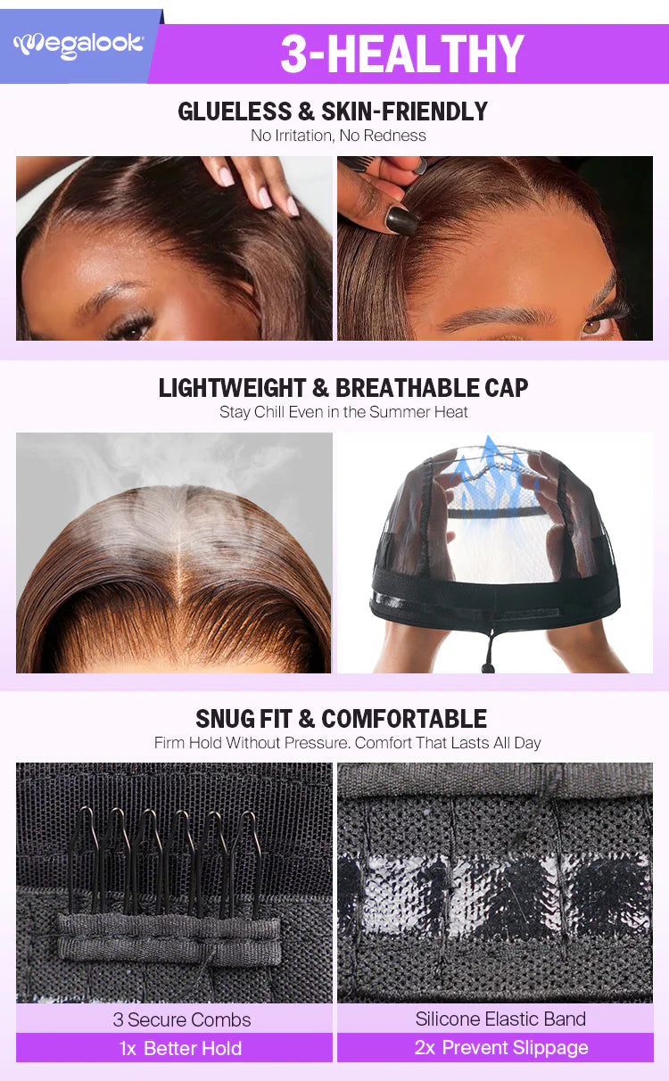 - Glueless & ready-to-wear — the 13×6 Three-Go™ lace frontal comes pre-cut with an elastic drawstring and inner straps, so you can wear it straight out of the box with no glue needed.